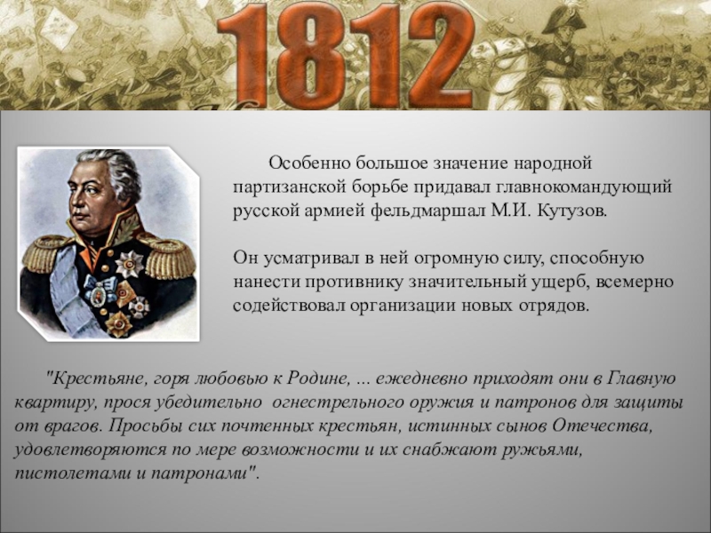 Особенно большое значение народной партизанской борьбе придавал главнокомандующий русской армией фельдмаршал