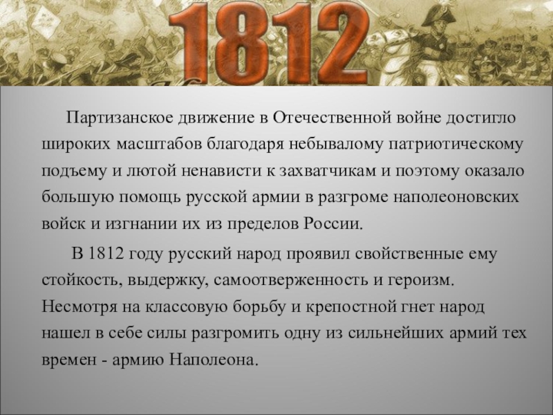 достигло широких масштабов благодаря небывалому патриотическому подъему и лютой ненависти к захватчикам и поэтому оказало большую помощь русской армии в разгроме наполеоновских войск и изгнании их из пределов России.