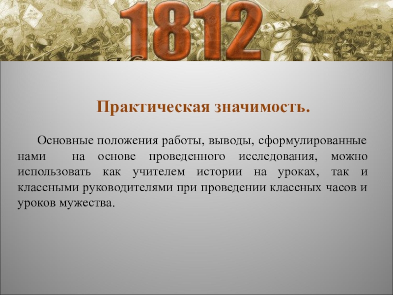 В 1812 году русский народ проявил свойственные ему стойкость, выдержку, самоотверженность и героизм. Несмотря на классовую борьбу и крепостной гнет народ нашел в себе силы разгромить одну из сильнейших армий тех времен - армию Наполеона.