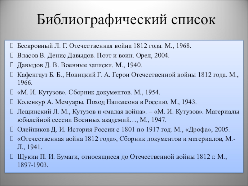 Бескровный Л. Г. Отечественная война 1812 года. М., 1968.