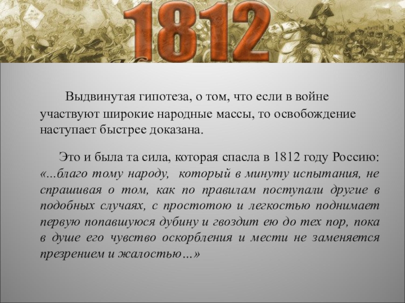 События Отечественной войны 1812, ее народный характер, тесная связь армии и народа показывает, что если в войне участвуют широкие народные массы, то освобождение наступает быстрее.