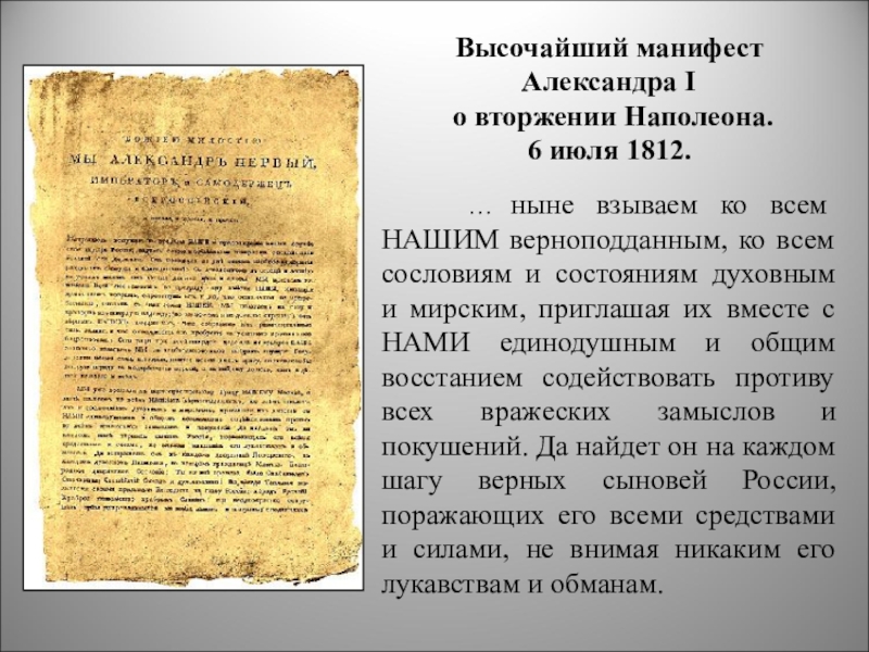 … ныне взываем ко всем НАШИМ верноподданным, ко всем сословиям и состояниям духовным и мирским, приглашая их вместе с НАМИ единодушным и общим восстанием содействовать противу всех вражеских замыслов и покушений. Да найдет он на каждом шагу верных сыновей России, поражающих его всеми средствами и силами, не внимая никаким его лукавствам и обманам.
