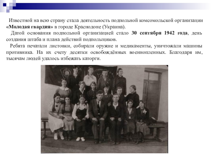 Слайд 11 Известной на всю страну стала деятельность подпольной комсомольской организации «Молодая