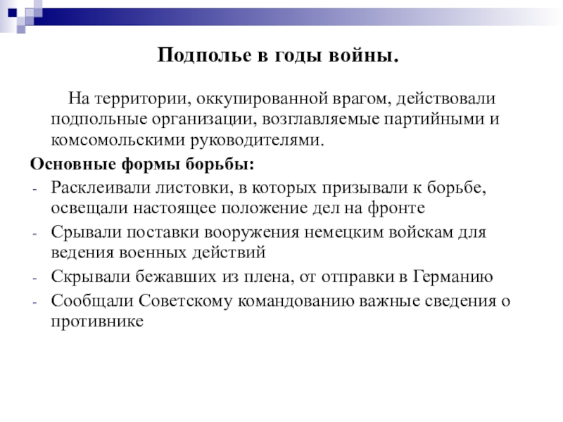 Слайд 13 Партизанское движение и большевистское подполье в тылу врага носили подлинно