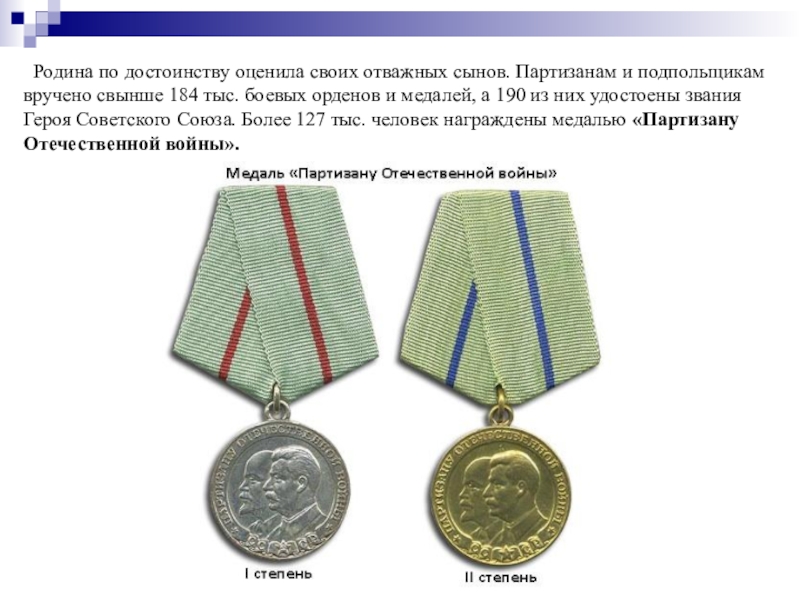 Слайд 14 Родина по достоинству оценила своих отважных сынов. Партизанам и подпольщикам