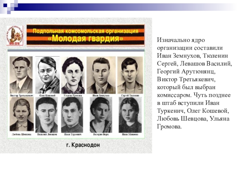 Арутюнянц, Виктор Третьякевич, который был выбран комиссаром. Чуть позднее в штаб вступили Иван Туркенич, Олег Кошевой, Любовь Шевцова, Ульяна Громова.