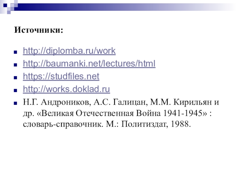 1941-1945» : словарь-справочник. М.: Политиздат, 1988.