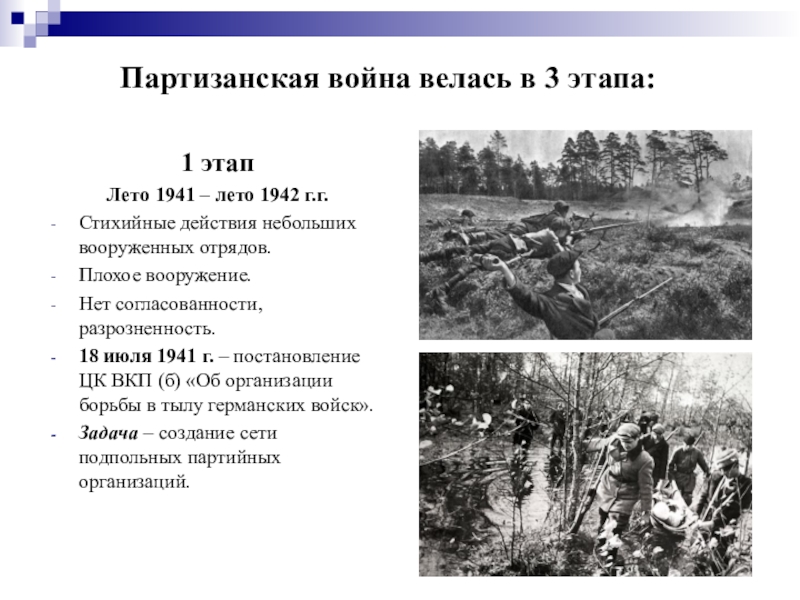 широкий народно - патриотический характер. Они полностью отвечали тем требованиям, которые к ним были предъявлены в выступлении И.В. Сталина 3 июля 1941 г.: «В захваченных районах создавать невыносимые условия для врага и всех его пособников, преследовать и уничтожать их на каждом шагу, срывая все их мероприятия».