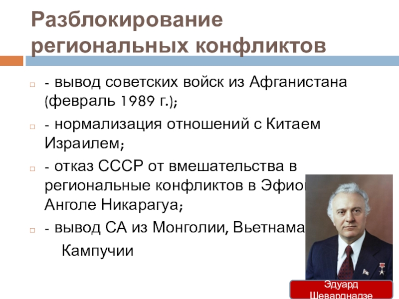- отказ СССР от вмешательства в региональные конфликтов в Эфиопии Анголе Никарагуа;