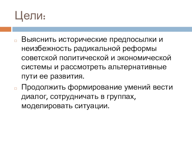 Выяснить исторические предпосылки и неизбежность радикальной реформы советской политической и экономической