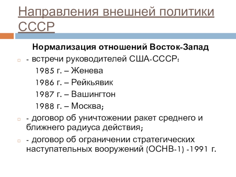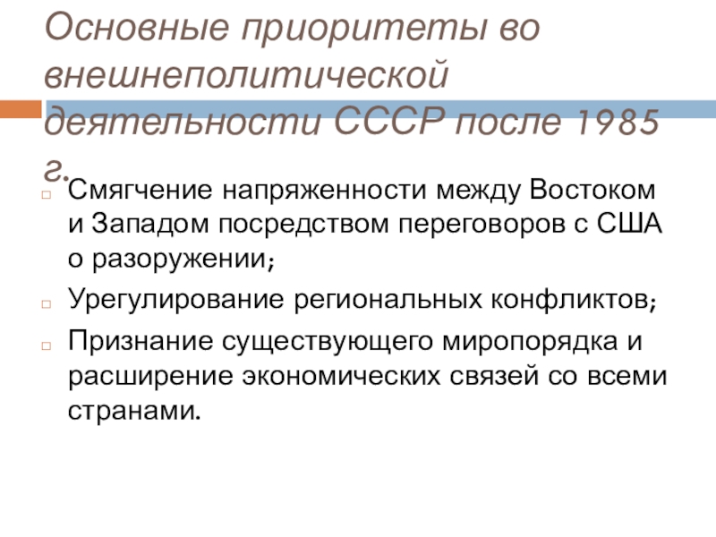 Слайд 19Основные приоритеты во внешнеполитической деятельности СССР после 1985 г.