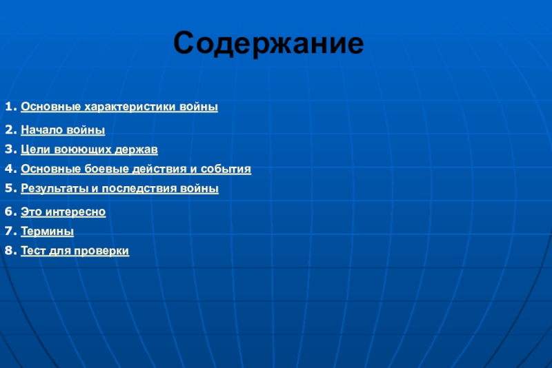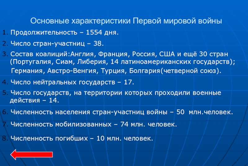 6. Численность населения стран-участниц войны – 50 млн.человек.