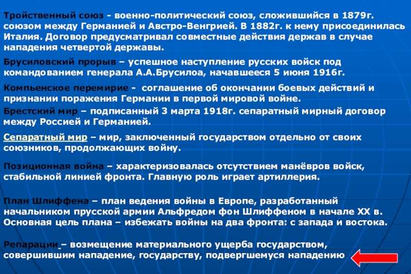 Позиционная война – характеризовалась отсутствием манёвров войск, стабильной линией фронта. Главную роль играет артиллерия.