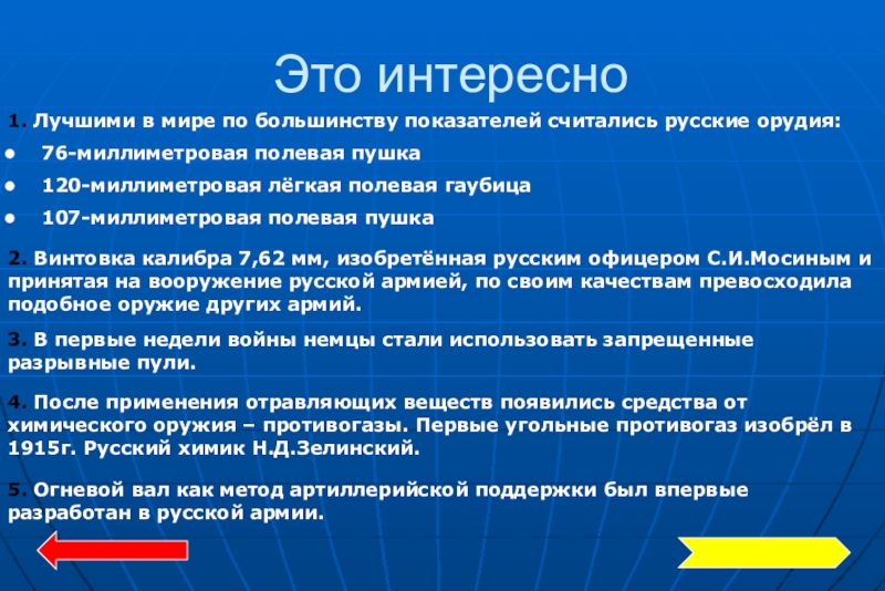 2. Винтовка калибра 7,62 мм, изобретённая русским офицером С.И.Мосиным и принятая на вооружение русской армией, по своим качествам превосходила подобное оружие других армий.
