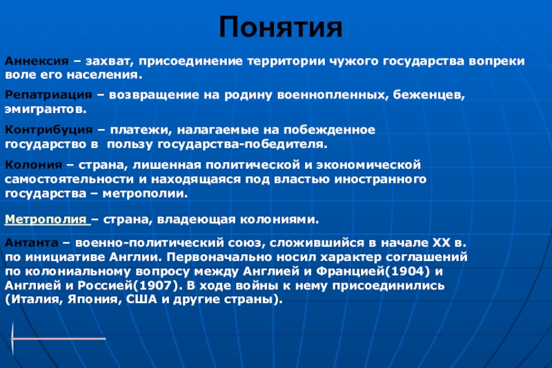 Антанта – военно-политический союз, сложившийся в начале ХХ в. по инициативе Англии. Первоначально носил характер соглашений по колониальному вопросу между Англией и Францией(1904) и Англией и Россией(1907). В ходе войны к нему присоединились(Италия, Япония, США и другие страны).