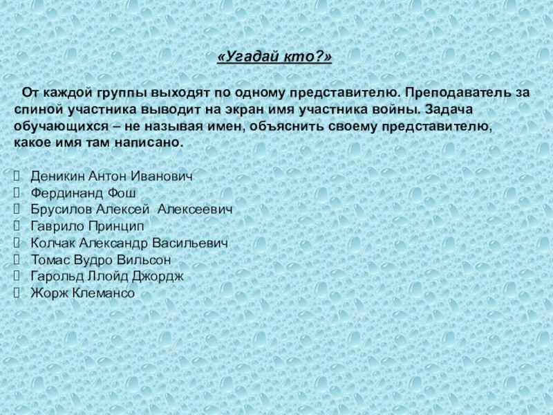 за спиной участника выводит на экран имя участника войны. Задача обучающихся – не называя имен, объяснить своему представителю,