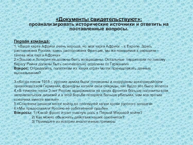 Вопросы: 1) Какой фронт играл главную роль в Первой Мировой войне?