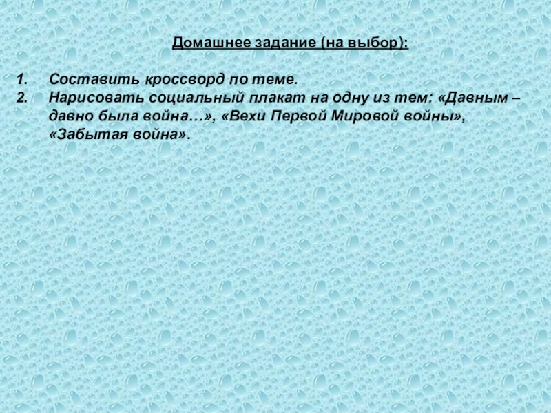 из тем: «Давным – давно была война…», «Вехи Первой Мировой войны», «Забытая война».