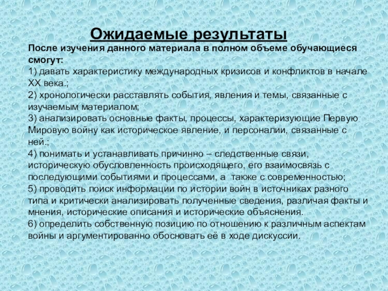 3) анализировать основные факты, процессы, характеризующие Первую Мировую войну как историческое явление, и персоналии, связанные с ней.;