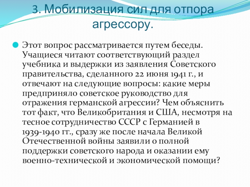 читают соответствующий раздел учебника и выдержки из заявления Советского правительства, сделанного 22 июня 1941 г., и отвечают на следующие вопросы: какие меры предприняло советское руководство для отражения германской агрессии? Чем объяснить тот факт, что Великобритания и США, несмотря на тесное сотрудничество СССР с Германией в 1939-1940 гг., сразу же после начала Великой Отечественной войны заявили о полной поддержки советского народа и оказании ему военно-технической и экономической помощи?