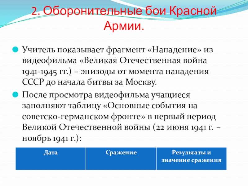 После просмотра видеофильма учащиеся заполняют таблицу «Основные события на советско-германском фронте» в первый период Великой Отечественной войны (22 июня 1941 г. – ноябрь 1941 г.):