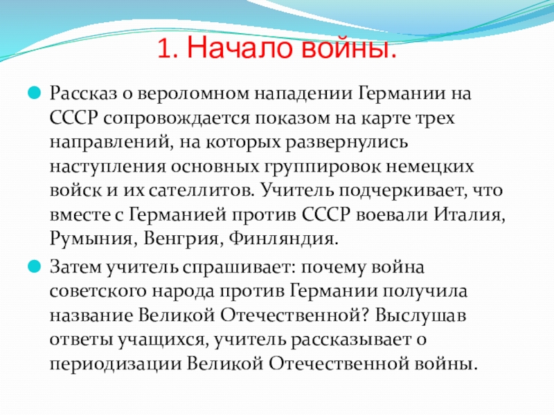 Затем учитель спрашивает: почему война советского народа против Германии получила название Великой Отечественной? Выслушав ответы учащихся, учитель рассказывает о периодизации Великой Отечественной войны.