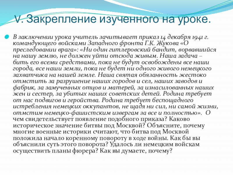 декабря 1941 г. командующего войсками Западного фронта Г.К. Жукова «О преследовании врага»: «Ни один гитлеровский бандит, ворвавшийся на нашу землю, не должен уйти отсюда живым. Наша задача – бить его всеми средствами, пока не будут освобождены все наши города, все наши земли, пока не будет ни одного живого немецкого захватчика на нашей земле. Наша святая обязанность жестоко отмстить за разрушение наших городов и сел, наших заводов и фабрик, за замученных отцов и матерей, за изнасилованных наших жен и сестер, за убитых наших советских детей. Родина требует от нас подвигов и геройства. Родина требует беспощадного истребления немецких оккупантов, не щадя ни сил, ни самой жизни, отмстим немецко-фашистским извергам за все и полностью». О чем свидетельствует появление подобного приказа? Каково историческое значение битвы под Москвой? Объясните, почему многие военные историки считают, что битва под Москвой положила начало коренному повороту в ходе войны. Как бы вы объяснили суть этого поворота? Удалось ли немецким войскам осуществить планы фюрера? Как вы думаете, почему?