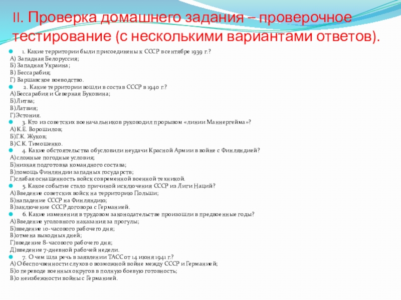 Слайд 5II. Проверка домашнего задания – проверочное тестирование (с несколькими вариантами ответов).