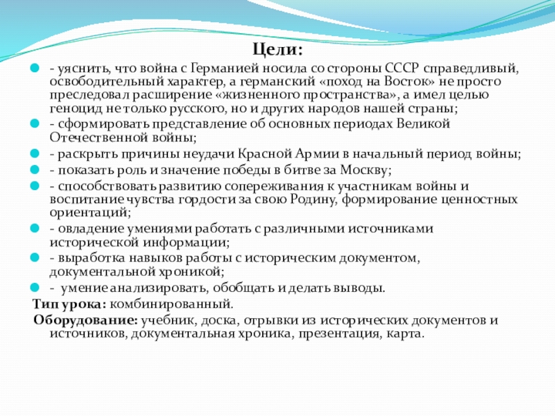 Оборудование: учебник, доска, отрывки из исторических документов и источников, документальная хроника, презентация, карта.