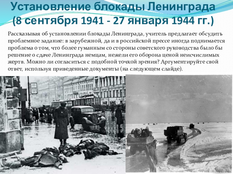 об установлении блокады Ленинграда, учитель предлагает обсудить проблемное задание: в зарубежной, да и в российской прессе иногда поднимается проблема о том, что более гуманным со стороны советского руководства было бы решение о сдаче Ленинграда немцам, нежели его оборона ценой неисчислимых жертв. Можно ли согласиться с подобной точкой зрения? Аргументируйте свой ответ, используя приведенные документы (на следующем слайде).