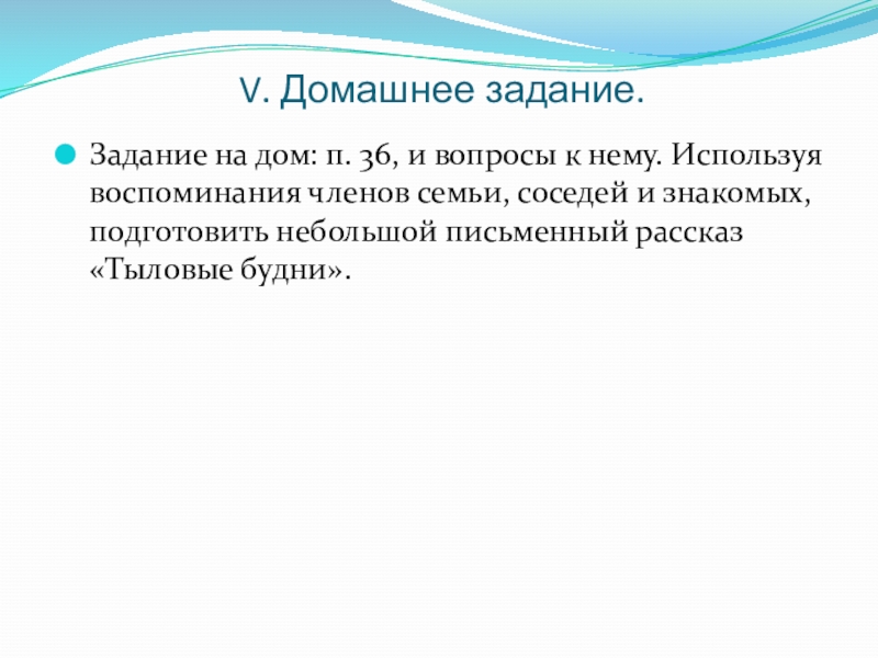 Используя воспоминания членов семьи, соседей и знакомых, подготовить небольшой письменный рассказ «Тыловые будни».