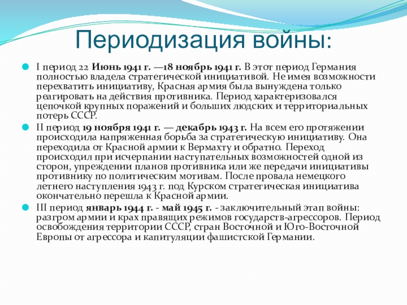 III период январь 1944 г. - май 1945 г. - заключительный этап войны: разгром армии и крах правящих режимов государств-агрессоров. Период освобождения территории СССР, стран Восточной и Юго-Восточной Европы от агрессора и капитуляции фашистской Германии.
