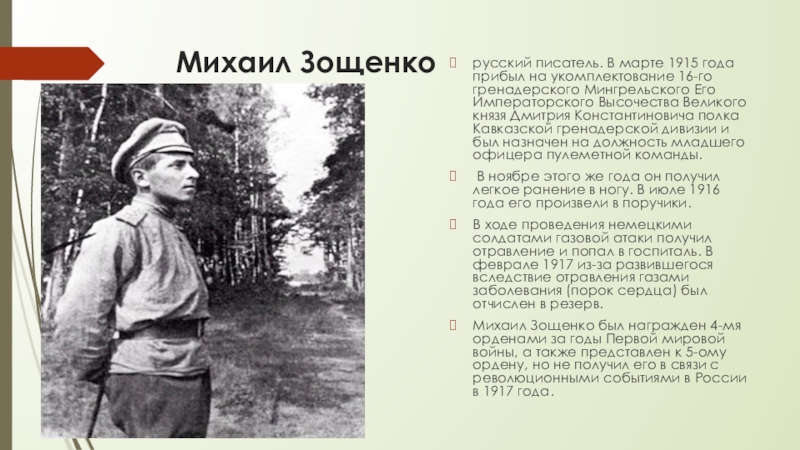 Михаил Зощенкорусский писатель. В марте 1915 года прибыл на укомплектование 16-го гренадерского Мингрельского Его Императорского Высочества Великого