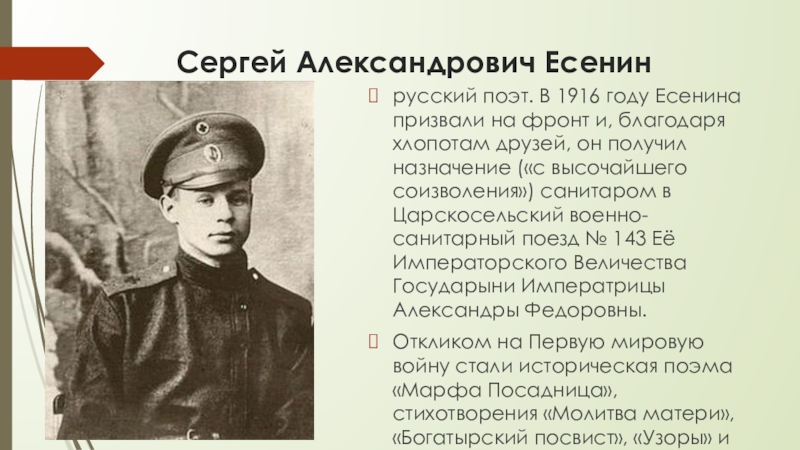 Сергей Александрович Есенинрусский поэт. В 1916 году Есенина призвали на фронт и, благодаря хлопотам друзей, он получил