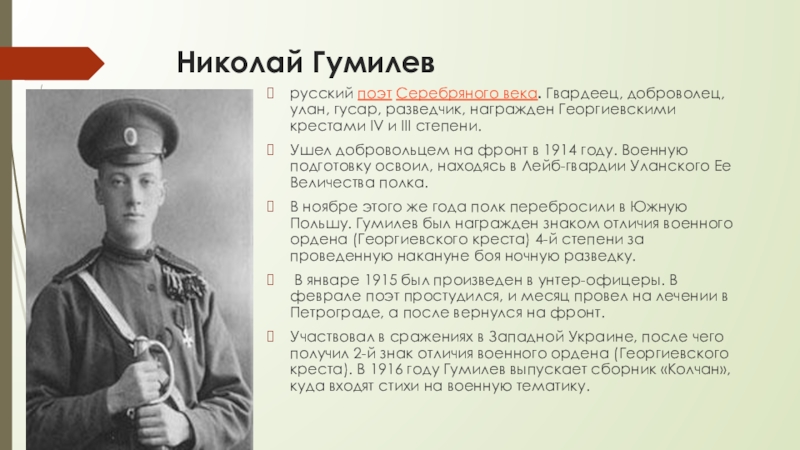 Николай Гумилеврусский поэт Серебряного века. Гвардеец, доброволец, улан, гусар, разведчик, награжден Георгиевскими крестами IV и III степени.