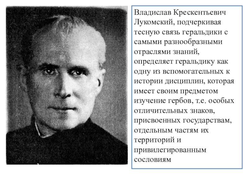 Слайд 3Владислав Крескентьевич Лукомский, подчеркивая тесную связь геральдики с самыми разнообразными отраслями