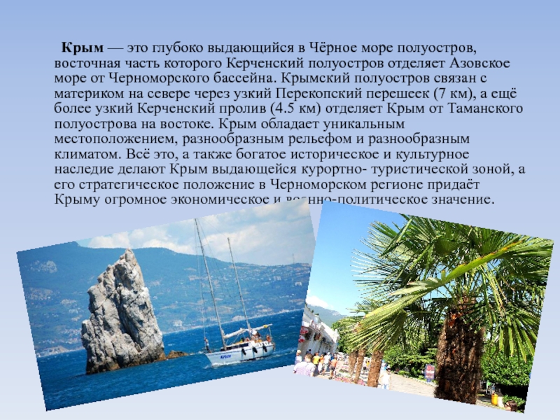 которого Керченский полуостров отделяет Азовское море от Черноморского бассейна. Крымский полуостров связан с материком на севере через узкий Перекопский перешеек (7 км), а ещё более узкий Керченский пролив (4.5 км) отделяет Крым от Таманского полуострова на востоке. Крым обладает уникальным местоположением, разнообразным рельефом и разнообразным климатом. Всё это, а также богатое историческое и культурное наследие делают Крым выдающейся курортно- туристической зоной, а его стратегическое положение в Черноморском регионе придаёт Крыму огромное экономическое и военно-политическое значение.
