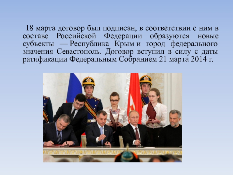 Российской Федерации образуются новые субъекты — Республика Крым и город федерального значения Севастополь. Договор вступил в силу с даты ратификации Федеральным Собранием 21 марта 2014 г.