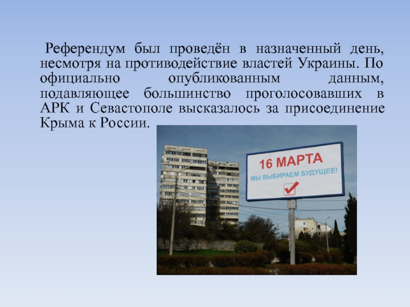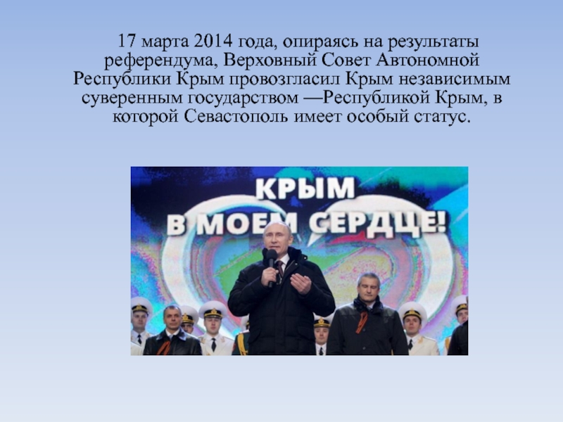 Слайд 7 17 марта 2014 года, опираясь на результаты референдума, Верховный Совет