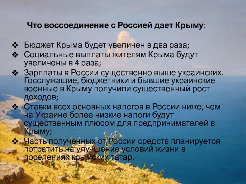 Слайд 15 Что воссоединение с Россией дает Крыму: