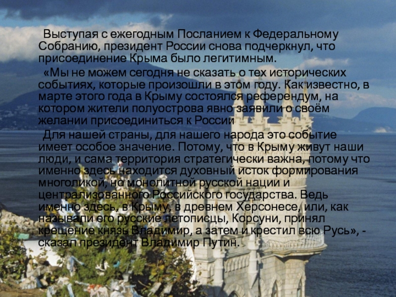Для нашей страны, для нашего народа это событие имеет особое значение. Потому, что в Крыму живут наши люди, и сама территория стратегически важна, потому что именно здесь находится духовный исток формирования многоликой, но монолитной русской нации и централизованного Российского государства. Ведь именно здесь, в Крыму, в древнем Херсонесе, или, как называли его русские летописцы, Корсуни, принял крещение князь Владимир, а затем и крестил всю Русь», - сказал президент Владимир Путин.