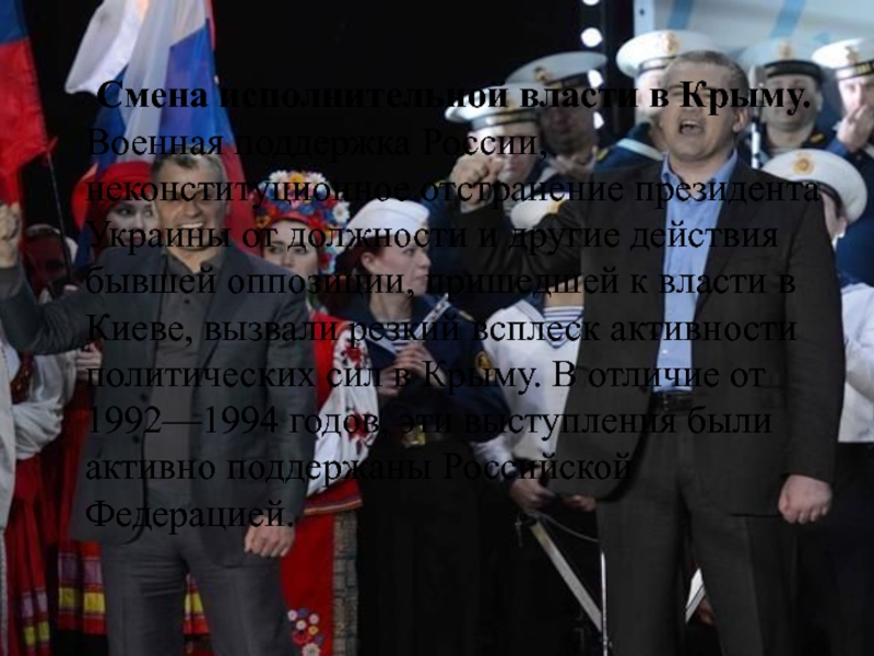 Слайд 3 Смена исполнительной власти в Крыму. Военная поддержка России, неконституционное отстранение президента