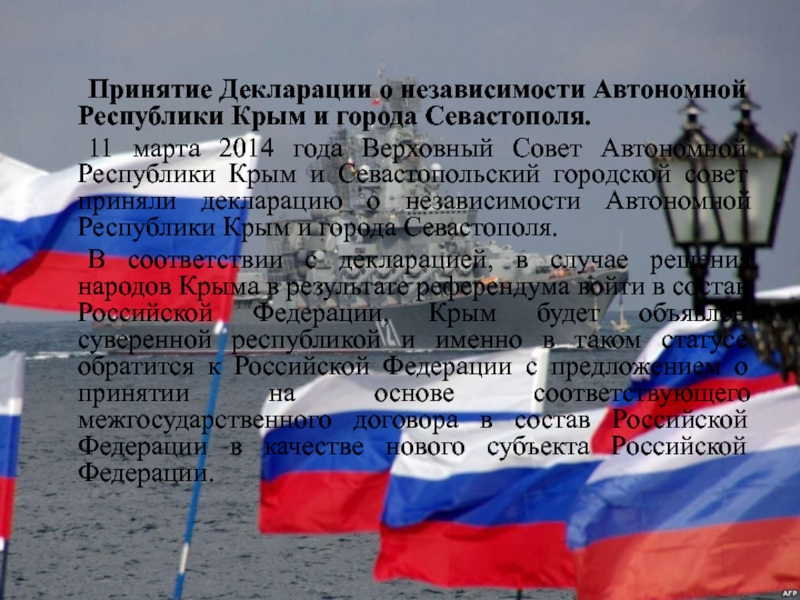 марта 2014 года Верховный Совет Автономной Республики Крым и Севастопольский городской совет приняли декларацию о независимости Автономной Республики Крым и города Севастополя.