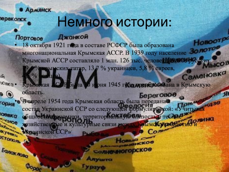 18 октября 1921 года в составе РСФСР была образована многонациональная Крымская АССР. В 1939