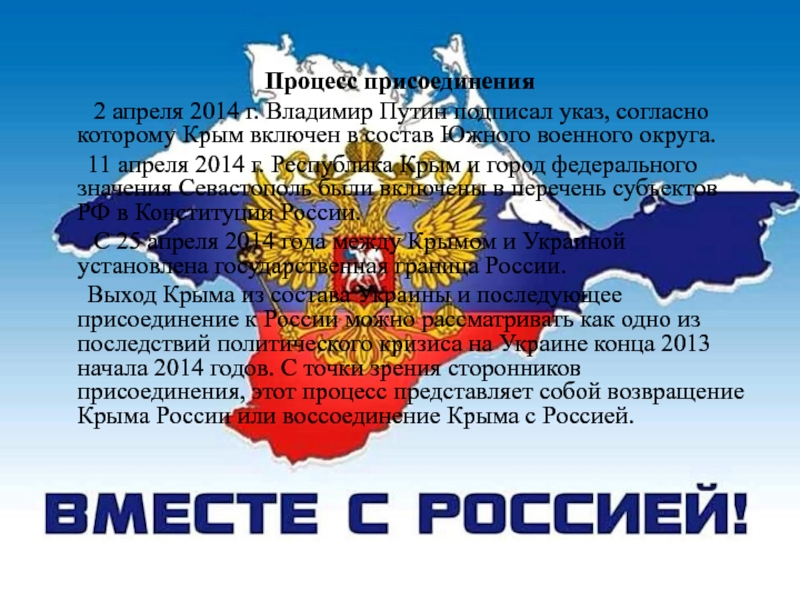 Слайд 2 Вхождение в состав Российской Федерации территории полуострова Крым с расположенными на