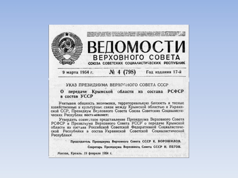 В апреле 1954 года Крымская область была передана в состав Украинской ССР со следующей формулировкой: «Учитывая общность экономики, территориальную близость и тесные хозяйственные и культурные связи между Крымской областью и Украинской ССР».