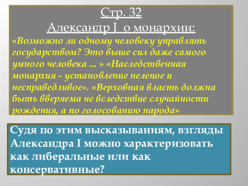 Судя по этим высказываниям, взгляды Александра I можно характеризовать как либеральные или как консервативные?