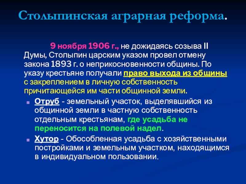 9 ноября 1906 г., не дожидаясь созыва II Думы, Столыпин царским указом провел отмену закона 1893 г. о неприкосновенности общины. По указу крестьяне получали право выхода из общины с закреплением в личную собственность причитающейся им части общинной земли.