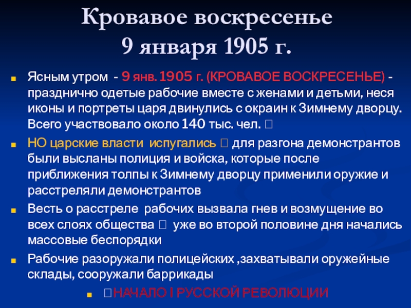 г. (КРОВАВОЕ ВОСКРЕСЕНЬЕ) - празднично одетые рабочие вместе с женами и детьми, неся иконы и портреты царя двинулись с окраин к Зимнему дворцу. Всего участвовало около 140 тыс. чел.