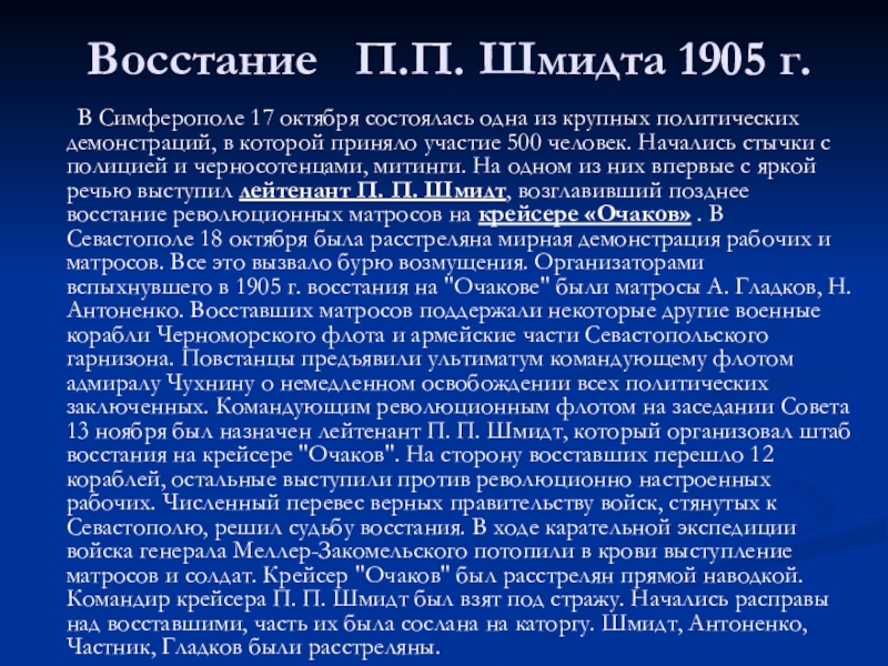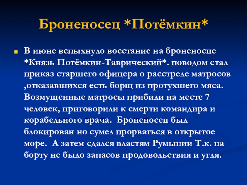 приказ старшего офицера о расстреле матросов ,отказавшихся есть борщ из протухшего мяса. Возмущенные матросы прибили на месте 7 человек, приговорили к смерти командира и корабельного врача. Броненосец был блокирован но сумел прорваться в открытое море. А затем сдался властям Румынии Т.к. на борту не было запасов продовольствия и угля.